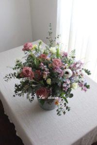 ご注文はお電話を頂戴しました。「ラドゥースさんでよろしいですか?わたくし、以前そちらからお花を頂戴したことがございまして、その時、とてもたくさんお花を頂戴したのですけれど、こちらのお花は素晴らしく素敵でとても心に残っていたものですから、今回は是非お花をお願いしたいと思いましてね…」。こんな風に仰っていただけるなんて感激でした。
