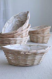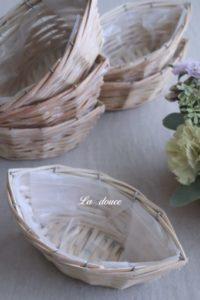 船形のバスケットを多種の花々で装うバトースタイルアレンジメントです