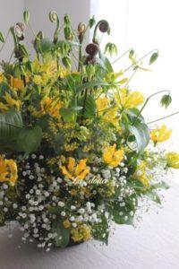 「花内容はお任せ」と頂戴したご依頼でしたがそんな場合も私が好き勝手に作ることはせずに、ご先方様企業HPなどを拝見してコーポレートカラー・企業理念・事業内容などをお調べしまして企業様イメージやお祝い内容に相応しい色や花を私なりに考えて形にするようにしています。送り主会社様とご先方様の間で「この前のあの花、良かったね、目立ってたね」なんて、少しでも話題になる役目ができれば嬉しいなと思っています。